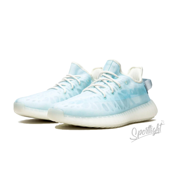 A última versão do popular Tênis adidas Yeezy Boost 350 V2 "Mono Ice" apresenta uma nova parte superior translúcida em azul claro que obscurece o design de uma gaiola de teia logo abaixo. O detalhamento vem na forma de abas de puxar, laços e palmilhas correspondentes. Completando o design do sapato, há uma sola BOOST encapsulada de comprimento total que continua a estética translúcida encontrada na parte superior.