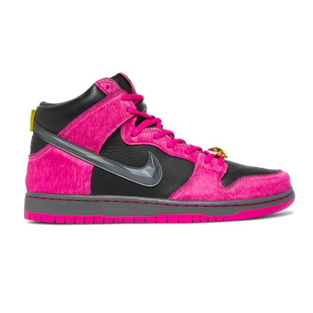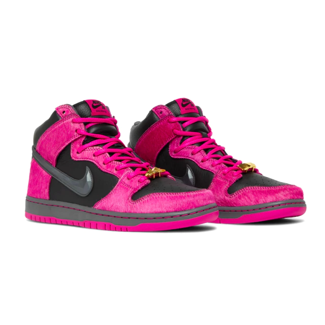 The Run The Jewels x Nike Dunk High SB '4/20' presta homenagem à influente dupla de hip-hop formada por El-P e Killer Mike. Seu som dinâmico é refletido nas cores e texturas contrastantes do sapato, destacadas por uma parte superior de couro preto com sobreposições de cabelo de pônei em um tom ousado de fúcsia. A assinatura preta Swoosh apresenta um exterior esculpido e polido, enquanto o laço dubrae brilha em ouro metálico. Os detalhes ocultos incluem uma impressão 'Run The Jewels' inscrita no interior de cada aba da gola e um bolso escondido na língua interior. O cano alto é montado em uma sola de borracha que combina paredes laterais pretas com uma sola fúcsia.