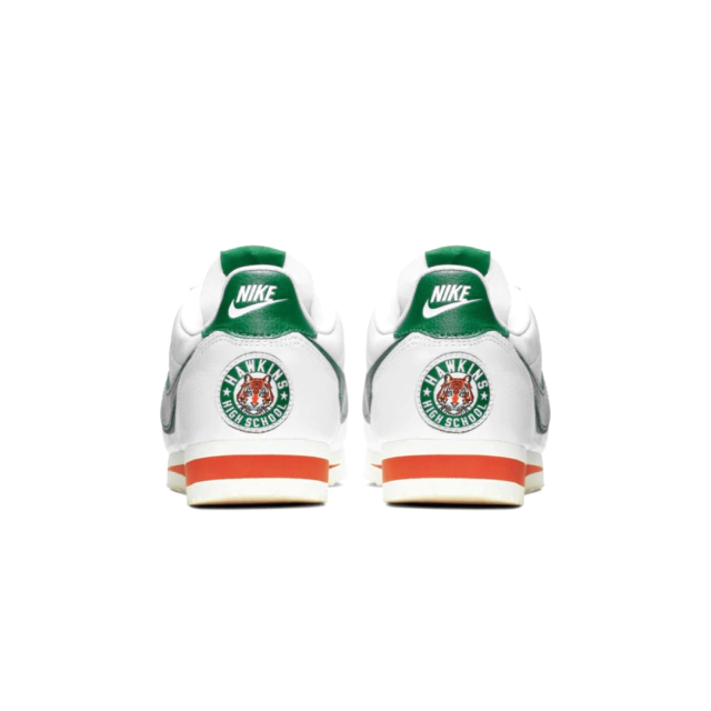 Com um cabedal de couro de alta qualidade, o tênis destaca-se pelas cores vibrantes de Hawkins High, verde e laranja, que se sobrepõem a uma base branca limpa. Cada detalhe conta uma história: a marca 'Stranger Things' na língua e o emblema bordado no calcanhar trazem à tona o mascote da escola, adicionando um toque exclusivo que fãs e colecionadores não vão querer perder.